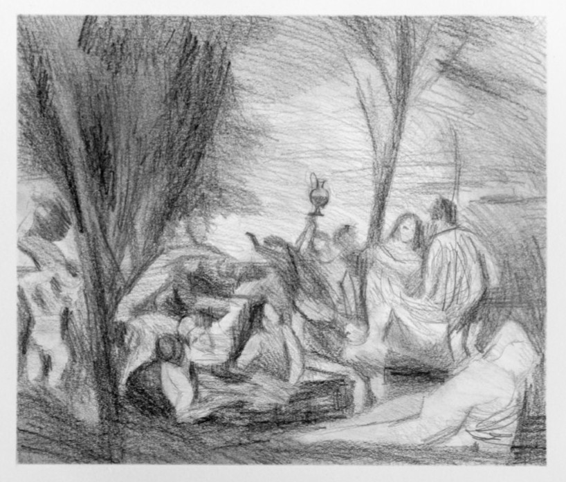 The project is a loose interpretation of Titian’s The Bacchanal of the Andrians, in which Peter Rolsted reconstructs the scene using friends, acquaintances, and himself as models. The aim is both to make a direct reference and to recreate the luminosity and grandeur characteristic of the paintings of that period.